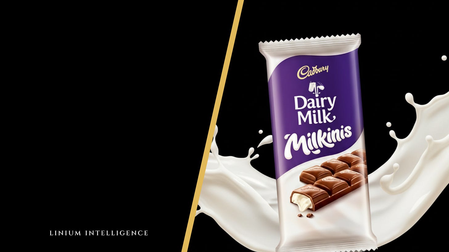 - Beyond economics, Milkinis also strengthens Cadbury’s distinct brand positioning. Dairy Milk has long stood for generosity and quality through its iconic “glass and a half of milk” message. By emphasizing a creamy milk-based filling, Milkinis directly ties back to that heritage, reinforcing Cadbury’s identity as the chocolate brand most closely associated with milk richness and setting it apart from competitors.